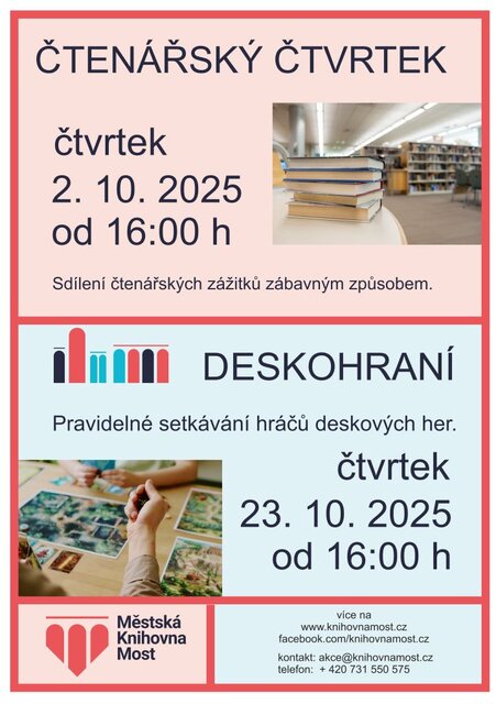 Potom jsou právě Vám určeny pravidelné Čtenářské čtvrtky v mostecké knihovně – vždy jeden čtvrtek v měsíci věnujeme prostor rozhovorům nad knihami.