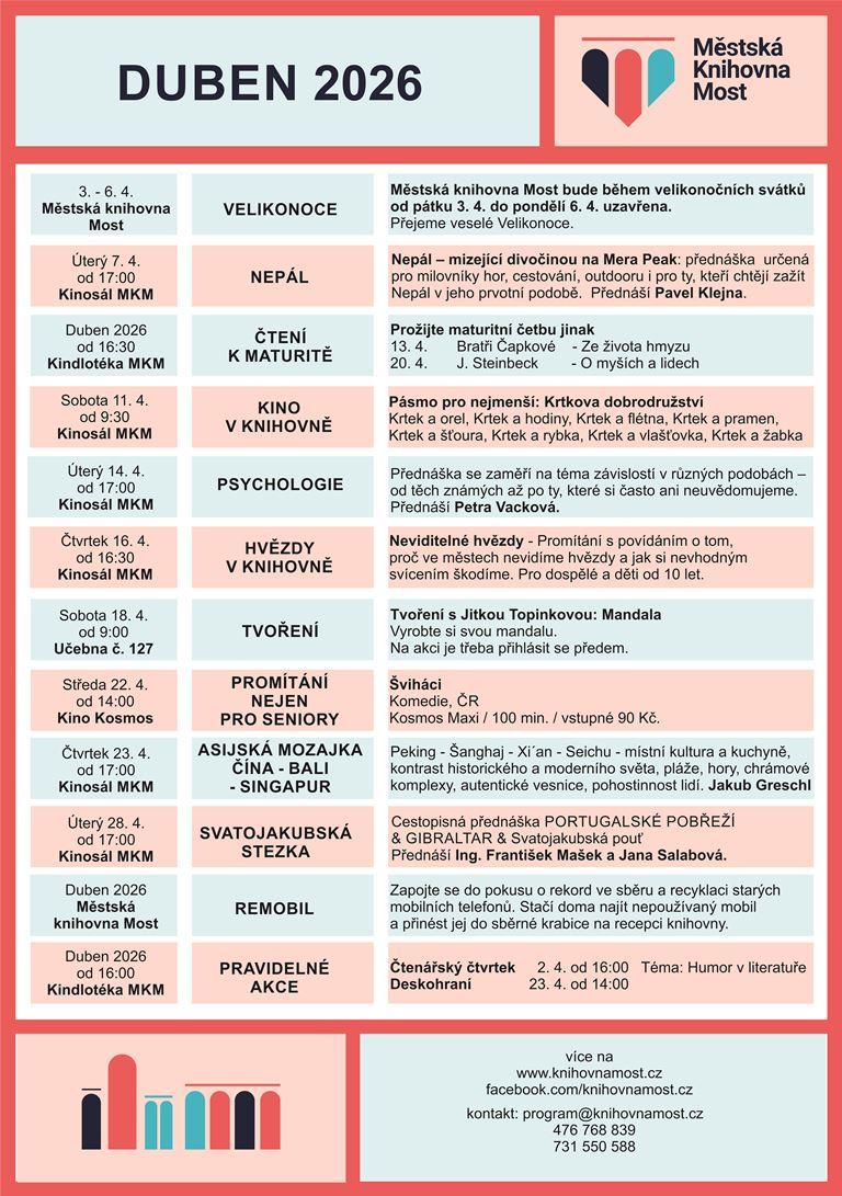 Tak neváhejte, akce jsou zcela zdarma, pouze je třeba se předem přihlásit na akce@knihovnamost.cz nebo na tel. 731 550 575.