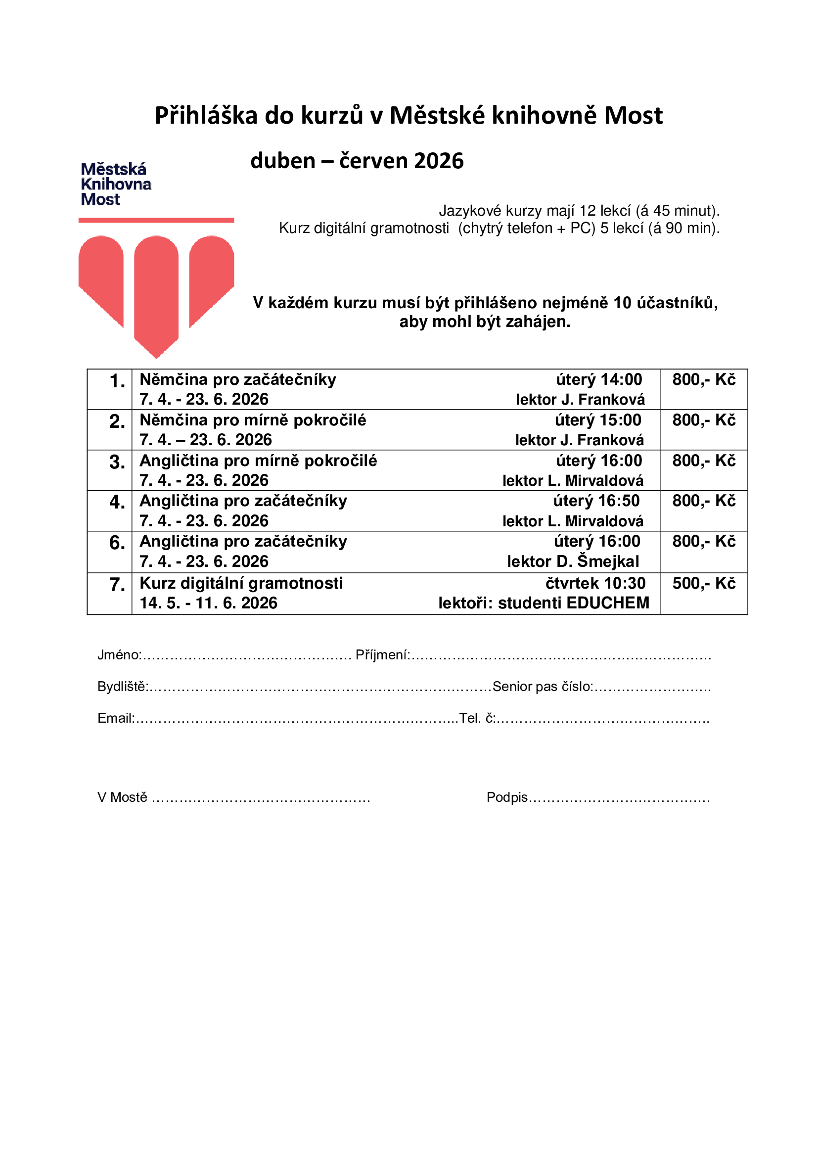 Kurzy budou zahájeny pouze v případě, že se přihlásí minimálně 10 účastníků.