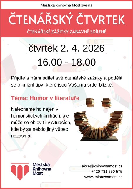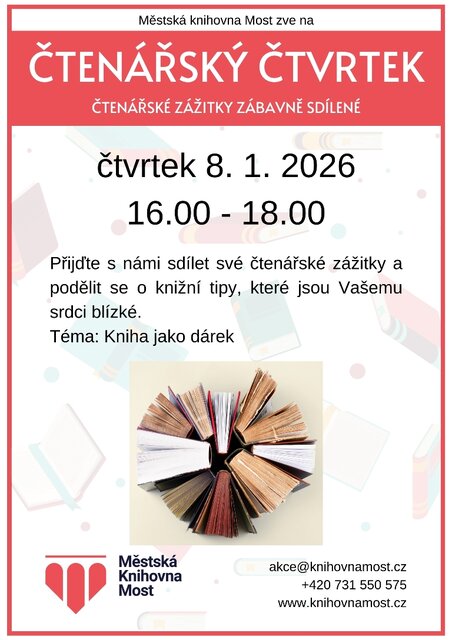 Potom jsou právě Vám určeny pravidelné Čtenářské čtvrtky v mostecké knihovně – vždy jeden čtvrtek v měsíci věnujeme prostor rozhovorům nad knihami.