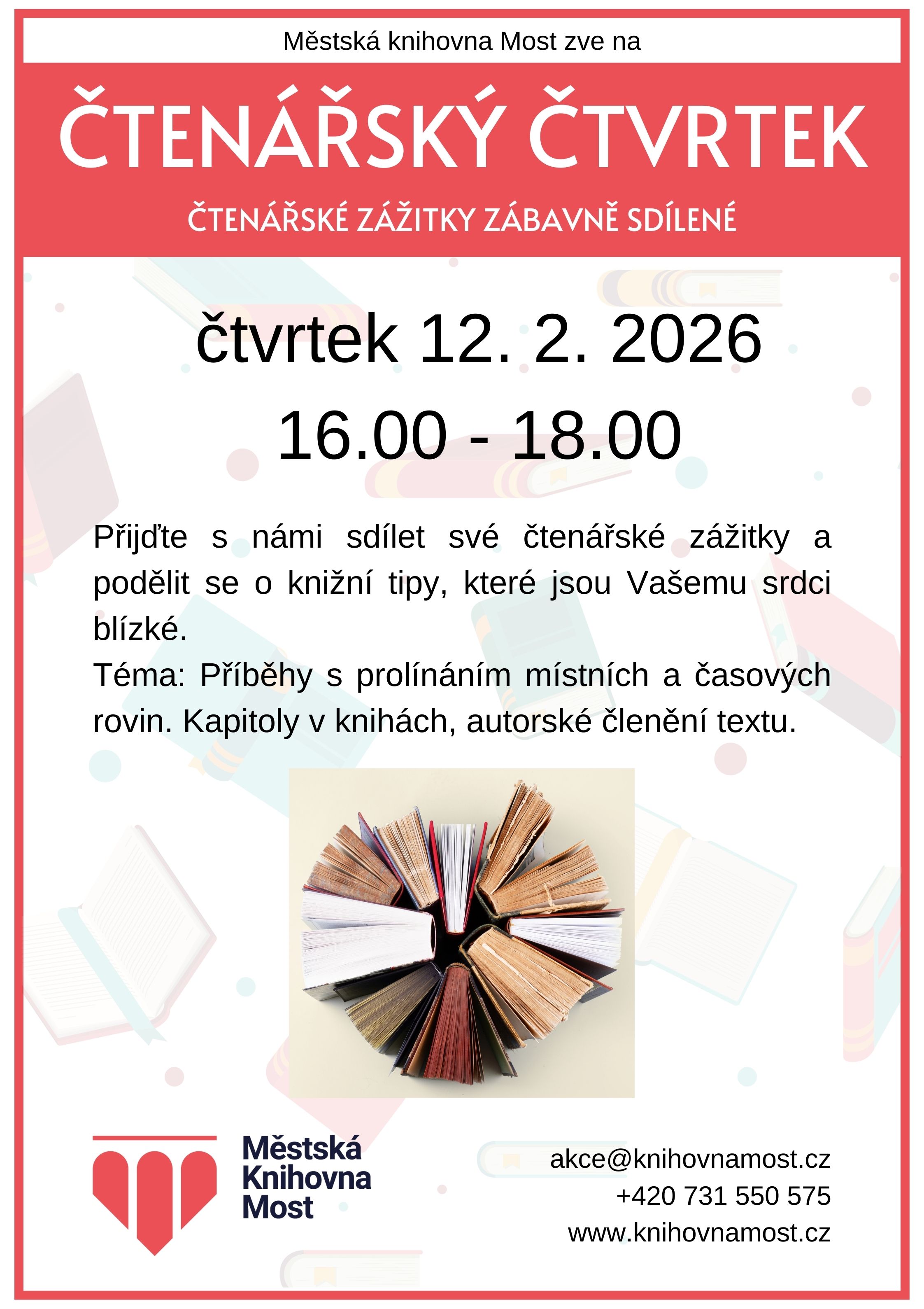 Potom jsou právě Vám určeny pravidelné Čtenářské čtvrtky v mostecké knihovně – vždy jeden čtvrtek v měsíci od 16:00 věnujeme prostor rozhovorům nad knihami.